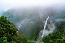 景區(qū)內(nèi)岱仙瀑布總落差約314米,單級落差184米,雄偉壯觀,被譽為“華東第一瀑”。晴天,陽光直射,水簾發(fā)光,彩虹若隱若現(xiàn),似巨幅珠簾下垂,像彩綢飛舞,蔚為壯觀。