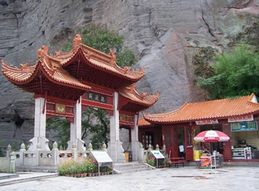 立于臺(tái)上,極目遠(yuǎn)眺,遠(yuǎn)處有一座紅瓦白墻的建筑位于陡峭懸崖的半山腰,那便是百丈巖景區(qū)的馬氏仙姑廟。馬氏仙姑廟是永安市香火最旺的廟宇之一。