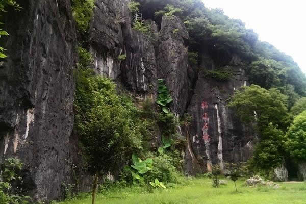 特殊地貌形成兩邊懸崖對(duì)峙,這條小澗叫桃花澗,從景區(qū)深處流出,我們的游路也將沿著高山峽谷的縫隙向內(nèi)延伸。桃源洞本沒有“洞”,無論是步行,還是泛舟游覽,都給人一種洞口的感覺右壁的懸崖高達(dá)120米,“桃源洞口”四個(gè)大字刻在36米高處,是明萬歷年間,辭官回永安的名士陳源湛于1605年所題,每字兩米見方。
