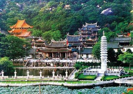 南普陀寺,位于廈門市思明區(qū),始建于唐末五代,初稱泗洲院。北宋僧文翠改建稱無盡巖。元廢。明初復(fù)建,更名普照寺。明末詩僧覺光和尚遷建于山前,殿堂院舍齊備,住僧常達(dá)百余眾,清初又廢于兵禍。清康熙二十二年(1684年),靖海候施瑯收復(fù)臺灣后駐鎮(zhèn)廈門,捐資修復(fù)寺院舊觀,又增建大悲閣奉觀音菩薩,并以之與浙江普陀山觀音道場相類比,更名為南普陀寺,此后數(shù)百年來,經(jīng)歷代主持景峰、省己、喜參諸和尚多次重修擴(kuò)建,至民國初年,已構(gòu)成三殿七堂俱全的禪寺格局。