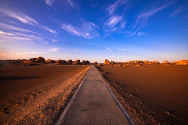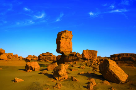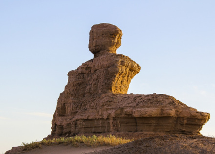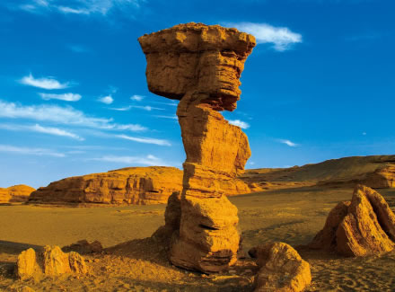 柱狀雅丹,是形態(tài)最為獨(dú)特的柱狀雅丹體。上部的粘土層難風(fēng)化,而下部的沙質(zhì)層卻易于風(fēng)化。這種差異形成了頂部粗大的塊體高懸于下部細(xì)小的柱體之上,在形態(tài)上似天外來(lái)客眺望凝思,吸引著游人去探索它的奧秘。