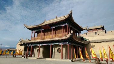 建于明正德元年(1506年),由時(shí)任肅州兵備副憲李端澄主持修建!肮饣瘶恰睘槿龑尤苄巾斒浇Y(jié)構(gòu),樓高17米。精雕細(xì)刻,五彩裝成。樓閣第一層為磚木結(jié)構(gòu),第二、三層是木結(jié)構(gòu)榫卯咬合而成,雖經(jīng)歷了近五百年的風(fēng)風(fēng)雨雨及地震等自然災(zāi)害,仍巍然屹立于關(guān)城之上。