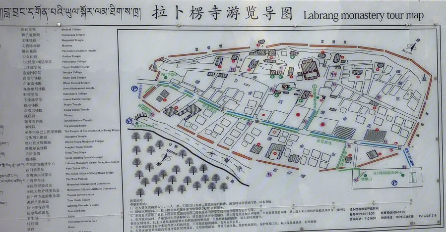 寺院坐北向南,占地總面積86.6萬平方米,建筑面積40余萬平方米,主要殿宇90多座,包括六大學(xué)院、16處佛殿、18處昂欠(大活佛宮。、僧舍及講經(jīng)壇、法苑、印經(jīng)院、佛塔等,形成了一組具有藏族特色的宏偉建筑群,房屋不下萬間。