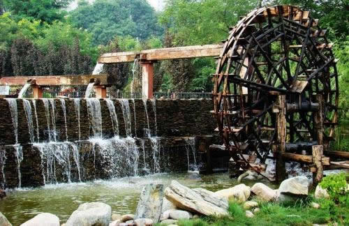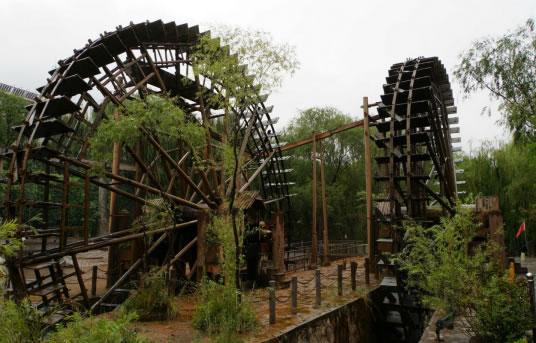 在水車廣場展現(xiàn)著各具特色的水車:在我們左側的是一架推水車(又稱水掛子),它依靠人力推動水車,將水提起,傾人水渠,灌溉農(nóng)田;在我們右側的是一架腳踏水車,其原理是用力踩動木輪,由傳動鏈條帶動水車,達到提水灌溉的目的;