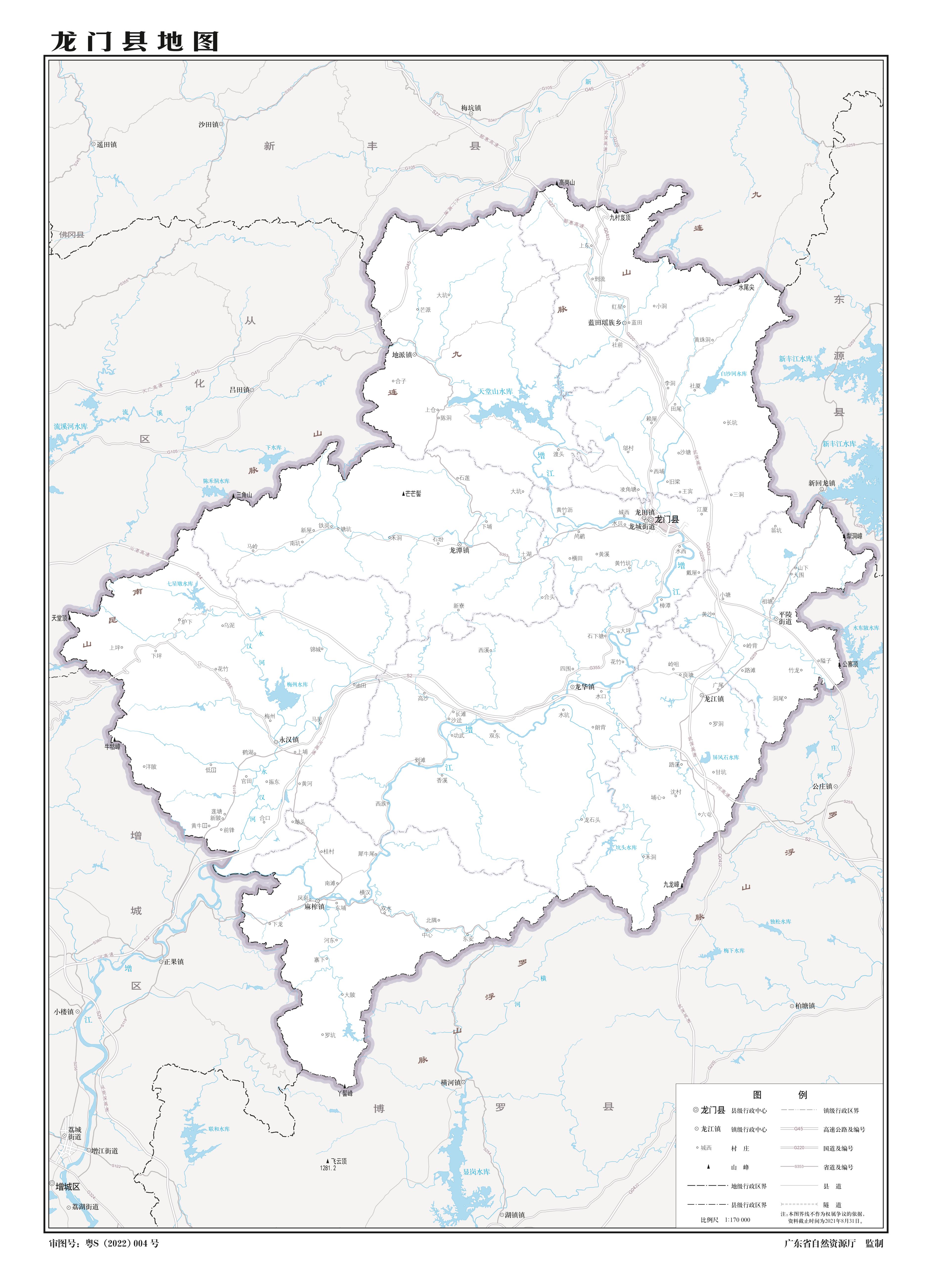 位置境域 龍門縣位于廣東省中部,增江上游,地處珠江三角洲邊緣,東南與河源市、博羅縣接壤,西南與從化市、增城市毗鄰,北與新豐縣相連。行政區(qū)域位于東經(jīng)113°48′26〞—114°24′58〞,北緯23°20′06〞—23°57′50〞之間?h內(nèi)土地廣闊,地勢自西北向東南傾斜,全縣總面積2267.2平方公里。