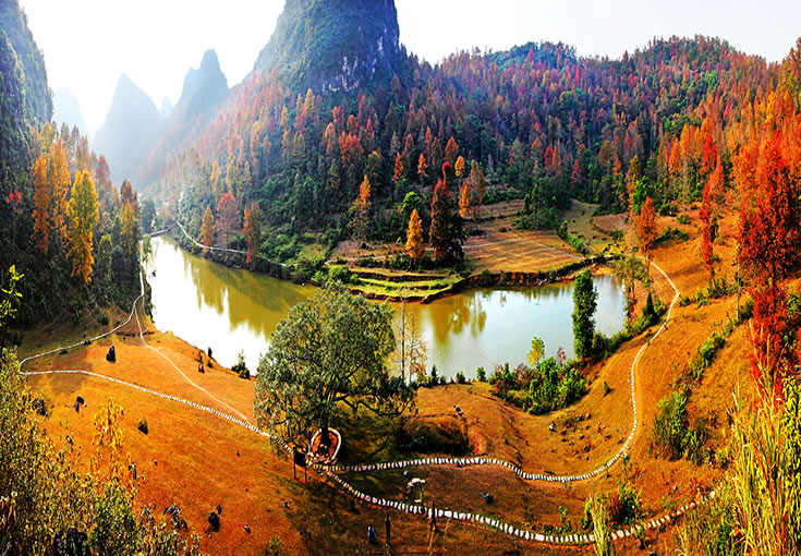 紅葉森林公園位于德?h東北側方向,國家AAAA級旅游景區(qū)暨自治區(qū)級森林公園,距縣城3.5公里,交通便利。公園規(guī)劃面積1036.5公頃,該公園核心景區(qū)為紅楓湖游覽區(qū)和紅葉谷游覽區(qū),以紅楓為主題。金秋時節(jié),楓葉似火,湖水輕柔,互襯互耀,頗具詩情畫意。公園的紅葉品種主要以楓香為主,葉子顏色分別有深紅、絳紅、霞紅、黃紅混合等,觀賞時間較長,有著“德保楓葉賽九寨”的美譽,是秋季里一道亮麗的風景線。公園以紅楓湖、紅葉谷一帶的紅楓林為依托,襯托著多姿多彩的紅葉森林景觀、森林生態(tài)景觀、底蘊深厚的人文景觀和綺麗迷人的水文景觀,將紅楓湖、上章湖、紅葉谷構成休閑避暑游覽的大旅游圈,景區(qū)內上章水庫和百布水庫交相輝映,總庫容量分別為365萬立方米和190萬立方米;有效灌溉面積分別為2200畝和2000畝。目前,景區(qū)各項基礎設施正在逐步完善。德保境內有10萬多畝連片的紅楓林,遍布城關、那甲、馬隘、巴頭等鄉(xiāng)鎮(zhèn)。除紅葉森林公園外,馬隘至巴頭一線還有許多別具特色的賞楓景點,無一不令人流連忘返。