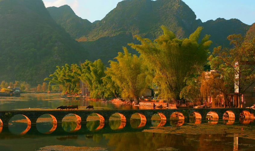 鵝泉,與云南大理蝴蝶泉、廣西桂平西山乳泉并稱為中國(guó)西南三大名泉。是世界第二大跨國(guó)瀑布德天瀑布的源頭,位于廣西靖西市區(qū)南約5千米的小鵝山麓。因鵝山像一只鵝躺在泉水之上,故名。為國(guó)家AAAA級(jí)旅游景區(qū)。 古橋,建于清朝年間,橋長(zhǎng)約60米,寬1.5米,全為石灰料石組成,是由15個(gè)涵洞的石拱橋組成,鵝泉古橋?yàn)榫肝魇斜A舻帽容^完整的古橋。
