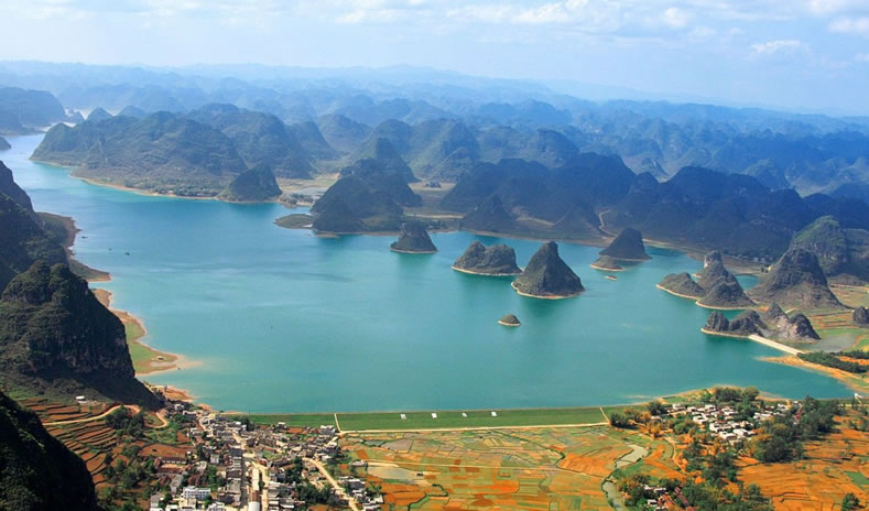 渠洋湖,是一個(gè)大型的喀斯特高原湖泊水庫(kù)。庫(kù)區(qū)總?cè)萘?228平方米,水質(zhì)優(yōu)良,有大小島嶼十多個(gè),沿岸有海拔一千多米的岜行山,以及掩映在綠樹翠竹當(dāng)中的幾百個(gè)壯族干欄式村寨。