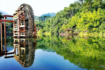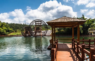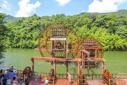 位于八寨溝景區(qū)大門外,是一個人工湖,湖面寬廣,三面環(huán)山,景色秀麗,可乘木船游覽龍珠湖風光,混凝土大壩外有人工瀑布,瀑布下面是深水潭,有一架仿古大水車,在流水驅動下不停轉動。