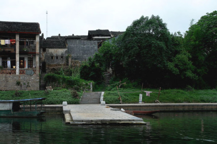 碼頭多用料石鑲砌,亦有因礁而設(shè)者。它們長10余米,寬約3米,皆伸入江底,浮出水面,呈長方形平臺狀。比起桂北一般圩鎮(zhèn)的碼頭來,它們顯得穩(wěn)重,大氣;若與武漢的江岸碼頭,北海的深水碼頭相比,則顯得小巧玲瓏,古樸秀美。它們順江排列,而兩者之間卻并不等距,具有一種錯落感,富有美學(xué)價值。碼頭靠岸的一端,多連有一段平地,或古榕濃蔭,或龍亭飛角,或丹桂飄香,或鳳竹搖曳,兼有實用和觀賞價值。碼頭與鎮(zhèn)區(qū)均有巷道相通,依坡砌級,石板鋪路,高墻夾擁,逼深邃,天光一線,給碼頭平添一種縱深感和活力。