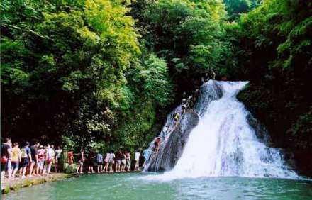 瀑布源頭比漓江水面高出180米,是我國唯一一個由地下涌泉形成的多級串連瀑布;是一個因鈣華沉積作用可逐漸長高而改變景致的瀑布。八級瀑布形態(tài)各異,有的如鴛鴦戲水,有的如蛟龍噴水,有的懸于長滿青苔的巖壁上,瀑水如布,水紋清晰可鑒,呈白色透明狀,猶如噴霧行云;有的水流集中下注跌入深潭濺起層層水霧浪花,猶如細(xì)雨蒙蒙,瀑布兩岸林木蔥郁,蔭蔽幽靜,水質(zhì)清洌,涼爽甘甜。山腳亞熱帶雨林濃郁,藤蔓垂壁,叢林險徑,三千多畝的楓樹和馬尾松,風(fēng)吹林動,鳥語花香,令人有回歸自然的親切感。到了深秋時節(jié)的紅楓更是別一番“霜林盡染,漫山紅遍,紅葉鋪滿山徑”的美景。