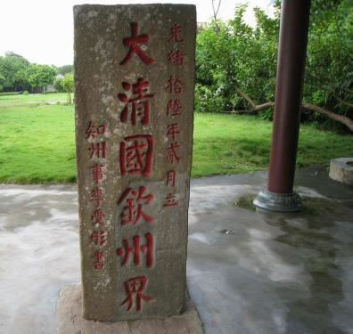 大清國(guó)一號(hào)界碑位于北侖河出海口的小山坡上,碑高1.7米,寬0.7米,厚0.4米,用沿海所產(chǎn)的海蝕巖鑿成。界碑正面書“大清國(guó)欽州界·知州李受彤書·光緒十六年二月立”,涂著紅漆的莊嚴(yán)雄渾的大楷碑文透著一股不可侵犯的凜然正氣。這塊飽受長(zhǎng)年風(fēng)吹日曬雨淋而益顯滄桑的巨石,一直昂揚(yáng)地巍然屹立著,向每一個(gè)游客訴說(shuō)著100多年來(lái)的每一段歷史。