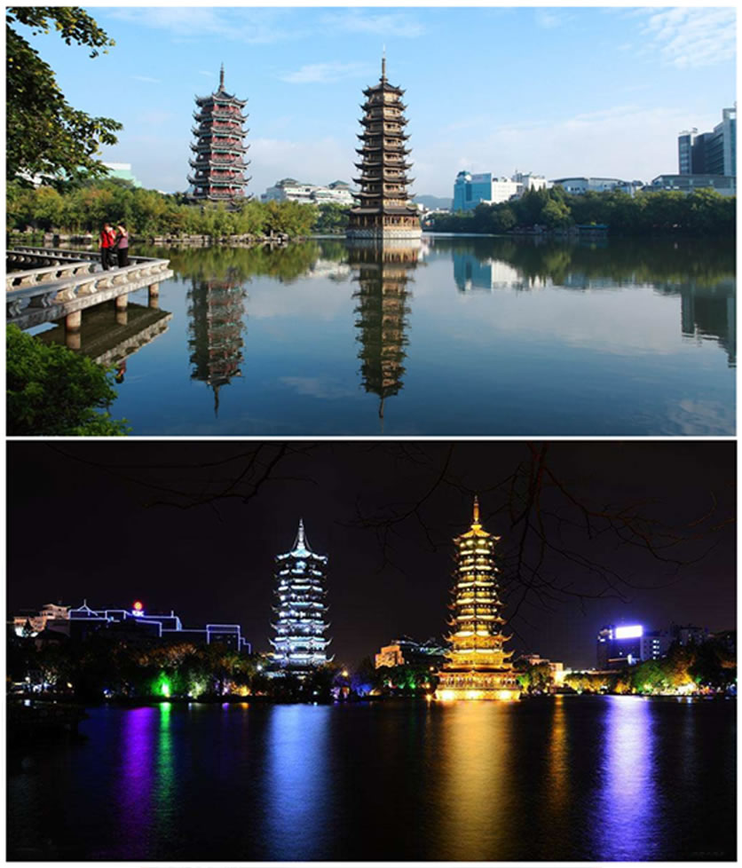 日月雙塔地處桂林市中心區(qū),坐落在桂林城的中軸線上,與“象山水月”相鄰。象山是桂林的城徽,而雙塔則是新桂林的標(biāo)識(shí)。日塔、月塔與象山上的普賢塔、塔山上的壽佛塔,相互呼應(yīng),相互映襯,有“四塔同美”之說。桂林日月雙塔號(hào)稱世界第一銅塔,是桂林旅游的一個(gè)夜景觀賞地。