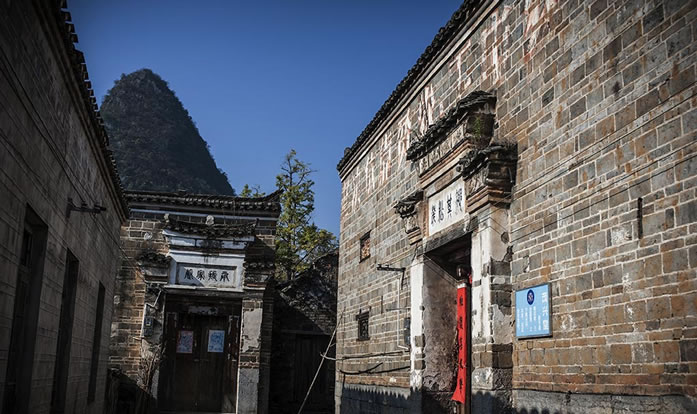 在明洪武年間,山東一位被貶的秦姓官員千里跋涉來(lái)到桂北地區(qū),據(jù)村民說(shuō),他們是唐代名將秦瓊的后人。后來(lái)秦氏的一支看中了水源頭村自周的山形地勢(shì),于是選取了這個(gè)“風(fēng)水寶地”落下根基。經(jīng)過(guò)多年繁衍,漸成規(guī)模。在后籠山下,依山勢(shì)拾級(jí)而建成了成片的大宅子,當(dāng)?shù)厝朔Q其為“秦家大院”。這些宅子基本為三進(jìn)三開,房屋分為四組,組與組間隔兩米,形成狹長(zhǎng)的巷道,均以青石板鋪筑。宅子的高堂、戲院、花廳都敞開大門,兩旁房子的大門朝里開,很有意思。宅子的墻壁都以幾噸重的青石方墩為基,砌上1米多后,改用青磚砌至屋頂,很獨(dú)特。高大敞亮的上層樓房,窗戶上鑲嵌的窗花是琉璃瓦燒制而成,上面還畫著花卉,溫婉中透著古色古香。房中的板壁上刻著各種花紋的圖案,庭柱下的石礅上鑿有龍鳳的花飾,精細(xì)美觀。