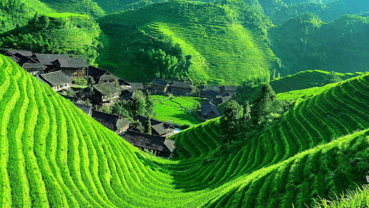 龍脊梯田,因山脈如龍的背脊而得名,是廣西著名風(fēng)景區(qū),始建于元朝,有近700年的歷史。龍脊梯田景區(qū)主要分為平安壯寨梯田和金坑紅瑤梯田。平安壯寨梯田有“七星伴月”和“九龍五虎”兩大著名景觀;金坑紅瑤梯田有“大界千層天梯”,“西山韶樂”和“金佛頂”三大著名景觀。這里的壯、瑤民族世世代代居住在青瓦木樓之中,淳樸善良。金竹壯寨被聯(lián)合國教科文組織稱為北壯的楷模;黃洛紅瑤寨獲上海大世界吉尼斯集體長發(fā)村之最;龍脊古壯寨至今保留著許多文物古跡。