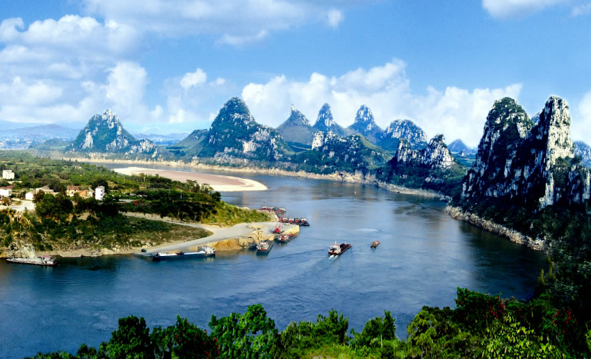 五馬攔江,位于武宣縣城南郊,黔江南岸有5座弧列的山巒,活似5匹駿馬,將黔江截攔,強令黔江水繞東流,氣壯山河,江山輝映,景色迷人。在5匹駿馬之間,聳立一座竹筍狀的文筆峰,面對江中200余米長的橢圓形沙洲,俗稱:“古磧?yōu)?rdquo;,是武宣縣老八景之一—《古磧鐘聲》。昔日江水擊洲,聲如鐘鳴。