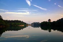 靈湖是一個(gè)自然湖泊,素有小西湖之美譽(yù),湖面寬780畝,其最深的地方可達(dá)30米。其水來自廣西靈川縣海洋鄉(xiāng)的海洋河。水質(zhì)清澈冰涼,四周青松翠柏倒影湖中,猶如一幅淡淡的山水潑墨畫!八鉃囦偾绶胶茫缴彰捎暌嗥妗