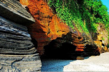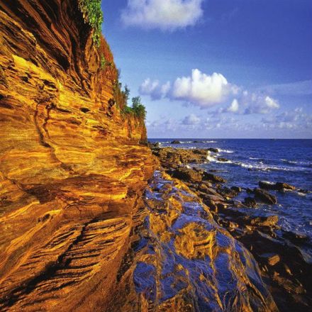 滴水丹屏原名滴水巖,位于潿洲島西部的滴水村,由巖石形成的懸崖峭壁是典型的海蝕地貌,裸露著的巖層,紅、黃、紫、綠、青五色相間,紋理十分清晰,崖頂之上藤樹纏繞,紅花綠葉倒掛崖頭,展現(xiàn)出旖旎多姿的色彩,故稱“丹屏”。巨崖巖層上長(zhǎng)年涌動(dòng)著水珠,不斷地向崖下滴落,所以取名“滴水”。滴水丹屏的形成堪稱是中國(guó)火山景觀的奇跡。