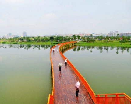 梧州園博園的整體景觀結(jié)構(gòu)為“一軸九片區(qū),三廊多節(jié)點(diǎn)”。一軸,指的是西入口的入園景觀軸,從西入口的龍湖大道開始,經(jīng)由跨湖橋一直延伸到東部山體;九片區(qū),是指沿著蒼海湖的東西兩岸,帶狀分布的原始地貌各異的九大片區(qū),分別為西岸濱水景觀區(qū)、水岸林舍片區(qū),蒼海公園片區(qū)等;三廊,指的市西岸親水綠廊,東岸濱水游憩體驗(yàn)區(qū),以及核心城市展示廊。而多個(gè)各具特色的景觀節(jié)點(diǎn),將有如明珠般分布在園博園各處,分別展示梧州的歷史文化、風(fēng)土人情,充分體現(xiàn)“西江明珠,嶺南新韻”的主題。