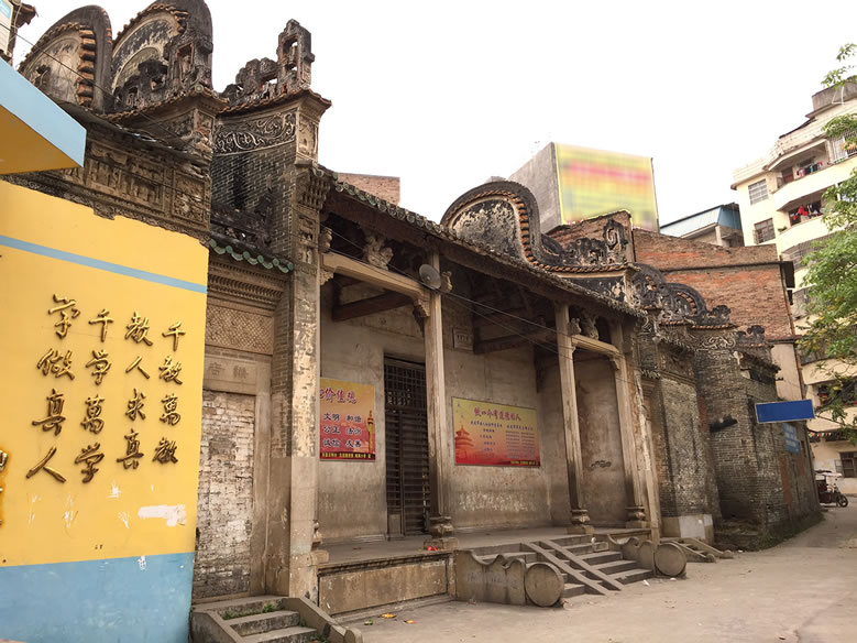北流粵東會(huì)館位于今北流市城區(qū)永安路一里9號。始建于清乾隆二十年(1755年),建筑坐西向東,原規(guī)模為三進(jìn)兩廂兩天井一戲臺,占地面積1400平方米,現(xiàn)僅存兩進(jìn)一廂,占地面積642.6平方米。硬山頂磚木結(jié)構(gòu),鑊耳山墻,小青瓦屋面、青磚墻,抬梁穿斗式混合梁架。屋脊灰塑雙龍戲珠及博古紋,前座檐墻及廂房墻端堆砌陶瓷樓閣人物圖,檐廊柱間梁以石獅如意云柁墩作承重,三根枋墩雕刻人物及如意云紋,雀替透雕吉祥紋飾。中座內(nèi)有4根花崗巖石柱支撐屋頂。庭院及通道均鋪設(shè)紅色階磚和花崗巖條石。