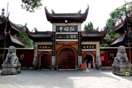 弘福寺為全國重點(diǎn)開放寺廟之一。清康熙十一年(1672年)由赤松和尚創(chuàng)建!昂敫!倍帜恕昂敕鸫笤,救人求世,福我眾生,善始善終”之意。沿九曲徑,經(jīng)二十四拐,可抵達(dá)弘福寺。弘福寺主要建筑有法化塔、九龍壁、大山門、鐘鼓樓、天王殿、觀音殿、大雄寶殿、玉佛殿、藏經(jīng)樓、說法堂、客堂、雙桂樓及方丈苑;有碑廊、素香齋、五觀堂和五百羅漢堂等大小建筑72座,加上放生池與茶樓等處,占地近11433平方米。徑旁摩崖石刻不絕,其中“虎”字高6米余,題名岱山趙德昌書,實(shí)為清著名書畫家孫清彥(竹雅)代筆。寺后象王嶺望城臺上(海拔1270米),建有“瞰筑亭”(1986年春劉海粟大師親書)。
