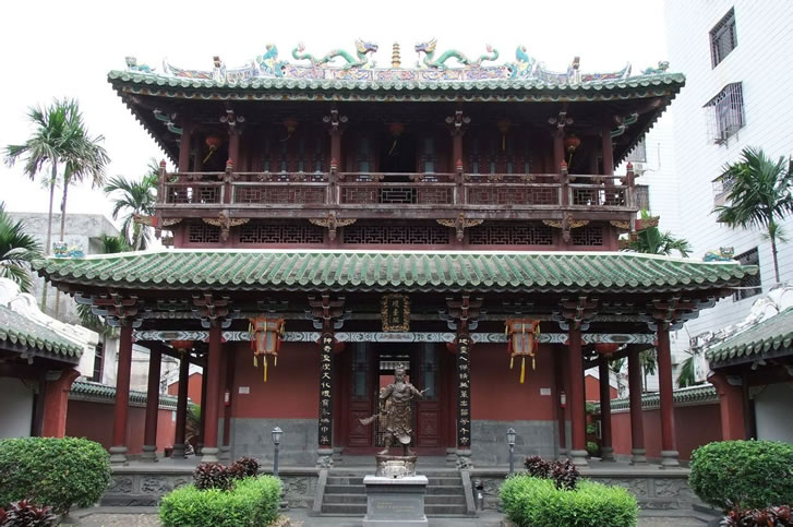 府城鼓樓位于府城鼓樓街,原名譙樓,又稱文明樓。始建于明洪武五年(1372年),明清兩代多次重修。臺基為明成化十七年(1481年)擴建而成,長28米,寬24米,高6.39米。兩拱門,寬4.6米,高7.1米,門額分刻“海南壯觀”、“奇甸文明”,F(xiàn)存鼓樓為清乾隆五十三年(1788年)重修,坐北朝南,面闊五間19.9米,進深三間9.95米,高7.56米,歇山頂,脊飾二龍朝日。樓內(nèi)原有明正統(tǒng)元年(1436年)銅禁鐘一口,鐘銘記述了捐資鑄鐘情況及祈求國泰民安之意,現(xiàn)存五公祠。