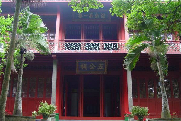 五公祠位于國興街道海府路169號,是為紀念唐宋時期貶謫到海南的五位著名歷史人物:唐朝名相李德裕、宋朝名相李綱、李光、趙鼎、名臣胡詮而建的,故名五公祠,現(xiàn)為全國重點文物保護單位。 五公祠為一組古建筑群的統(tǒng)稱,它由海南第一樓、觀稼堂、學(xué)圃堂、東齋組成,并和蘇公祠、兩伏波祠及其拜亭、洞酌亭、粟泉亭、洗心軒、游仙洞等連成一片,建筑面積2800余平方米,連同園林、井泉、池塘約占地100畝。始建于明萬歷年間,清光緒十五年(1889年)重修,后又多次修繕,現(xiàn)仍是熠熠生輝。