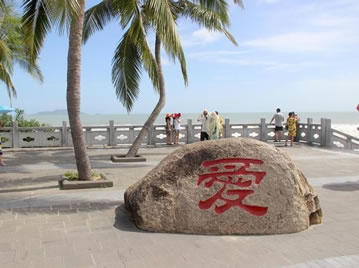 景點(diǎn)位于廣場(chǎng)的左右側(cè),在此矗立著兩塊石刻,左側(cè)的“愛”字,右側(cè)是“情定天涯海角,相愛白頭到老”。這愛情石刻圍繞著廣場(chǎng)中央的天涯海角星,與海面上的心形 “愛情石”遙相呼應(yīng)。