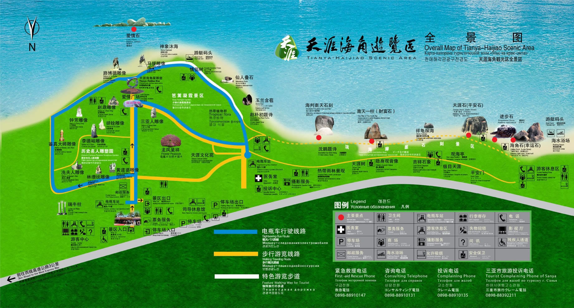 2、步行游覽線路:從大門口環(huán)繞歷史名人雕塑園游覽一圈,然后沿著海濱特色游覽步道行走,游覽笆籬凝霞景區(qū),欣賞熱帶植物群,繼續(xù)沿著步道走,游覽熱帶雨林景觀、天涯樹、隱身觀音像,到海邊觀看摩崖石刻群,然后原路返回,在電瓶車重點(diǎn)站處走天涯路步道,參觀天涯文化苑,然后經(jīng)三亞人雕像到愛情廣場(chǎng),沿主干道到景區(qū)出口。 |