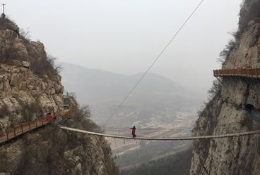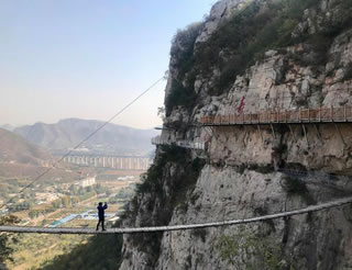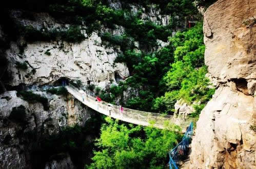佛爺洞與七星洞有一峽谷相隔,景區(qū)開發(fā)者便凌空架起一道35米開的鐵索橋,把天塹變?yōu)橥ㄍ臼箖啥聪噙B,人踏鐵索橋一步九顫蕩悠悠,頓生“大渡橋橫鐵索寒”之感。不過,這里的鐵索橋絕對安全,被人譽為“冀南一絕有驚無險”是游人獵奇探險鍛煉意志和膽量的絕佳場所。