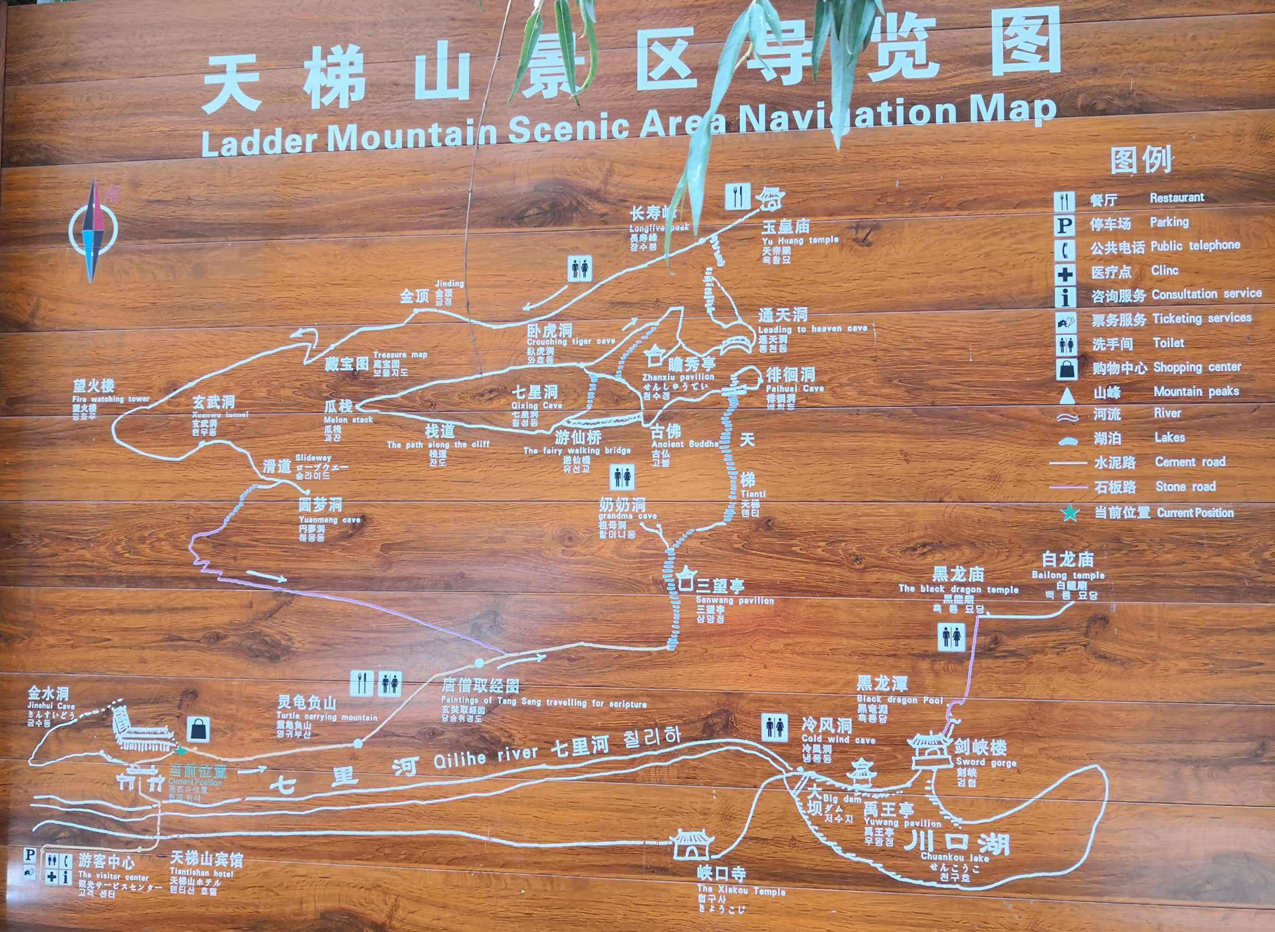 天梯山主峰長壽峰,俗稱金頂,垂直拔高550米,是觀日出的好地方。金頂上金石、玉石、雨花石儲量豐富,美麗的民間傳說為其增添了神奇的色彩。金頂一側(cè)裸露的巨石上鑲嵌一張藏寶圖,石紋盤結(jié)宛若天書,意象鮮明引人注目,猛一看雜亂無章,細觀瞧神工杰作,口碑流傳:“南坡至北坡,金子一大鍋,誰能解開謎,便是得寶者!”游客到此無不躍躍欲試,試圖解開“藏寶圖”之謎發(fā)一筆大財。