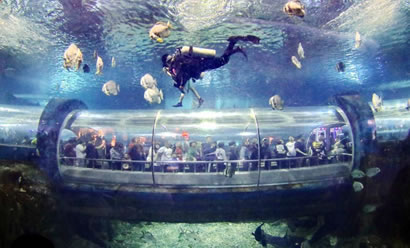 海底世界水族館飼養(yǎng)著來自世界各地的海洋動物200多種,共10,000多艉(頭),其中有大量國家一級、二級珍稀保護動物,檸檬鯊、豹紋鯊、護士鯊、海豚、江豚、綠海龜、海獅、海豹、蝠鲼、海狗供游人觀賞。270度環(huán)形的亞克力玻璃圍成的海底隧道全長100米左右,五光十色的珊瑚環(huán)繞在您的周圍,迷人的海底動植物盡收眼底。透過窗口還可以看到一個古羅馬被海水淹沒城市的石像造景。海豚表演館占地面積1萬平方米,建筑面積3,000平方米,總貯水量200萬千克,能同時容納2000多人同時觀看表演,以展示生活在海洋中哺乳動物的海獸表演為主,是一座具有國際標(biāo)準的海洋動物表演劇場。游客在此可以看到聰明可愛的海豚和滑稽可笑的海獅聯(lián)袂上演精彩紛呈的各項表演:海獅獻上迪斯科、倒立平衡、一獅兩球、套彩圈、單手倒立、頂球過障礙、親吻、水中交誼舞等一系列惟妙惟肖的表演;海豚上演的水中芭蕾舞、踢足球、環(huán)場鞠躬跳躍、伴著樂曲引吭高歌以及充分展示海豚智力的各種表演活動。