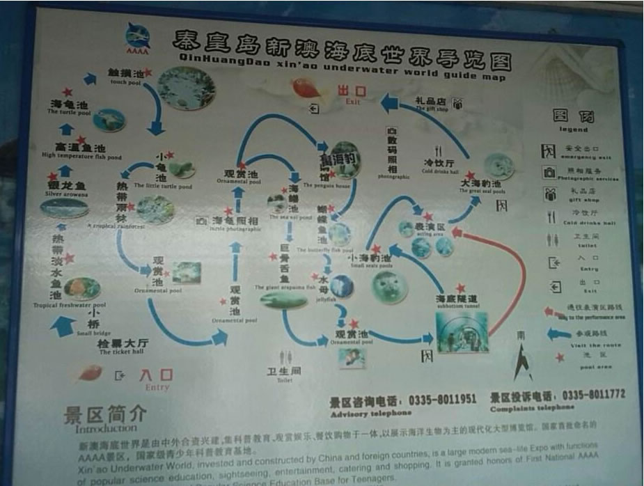 秦皇島火車站有公交車可直達景區(qū)。一期工程總投資人民幣1. 2億元,建筑面積1.3萬平方米,總儲水量約500.0000立升。主要由小池區(qū)、江豚龍宮、觸摸池、珊瑚海、雨林傳奇、企鵝館、海豹表演、海底探奇、深海之旅、科普展廳、科普教室、鳥雨林、巨蟲公園及海洋精品店、觀海鱷魚餐廳 等部分組成是集科普教育、環(huán)保教育、休閑娛樂于一體的科普教育基地。