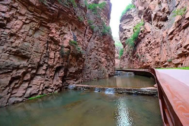 峽長4000米,一般寬1到2米,最窄處只有十幾厘米,壁高150米,這里紅巖絕壁,險峰對峙,黃巢曾在此聚兵起義,抬頭仰望,青天一線,俯視腳下,水流不斷,相隔不遠(yuǎn)便有一道瀑布,溪水清澈見底,清涼透骨。