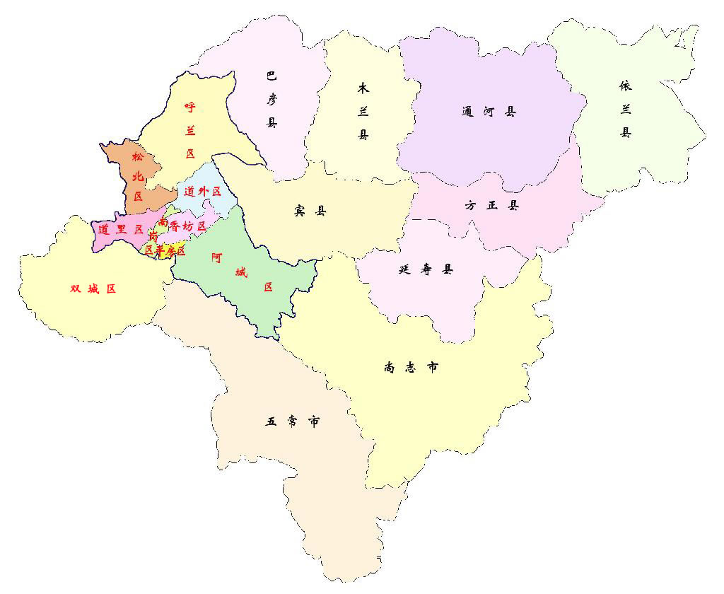 哈爾濱市轄9個市轄區(qū)、7個縣,代管2個縣級市: