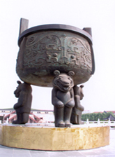 黃帝寶鼎壇區(qū)位于軒轅廟后,南北長(zhǎng)150米,東西150米,面積約2.25萬(wàn)平方米,由青石甬道銘文、民族圖騰柱、黃帝寶鼎壇和楹聯(lián)長(zhǎng)廊組成。青石甬道銘文鐫刻上自伏羲、神農(nóng)、黃帝,下迄21世紀(jì)近萬(wàn)年歷史,其中記有關(guān)黃帝在河南新鄭誕生、建都等史實(shí)。甬道銘文兩側(cè)鐫刻“客家人腳印”。民族圖騰柱聳立青石甬道兩側(cè),漢白玉石,10方,高3.6米,6棱,鐫刻中華民族56個(gè)民族的圖騰或族徽。黃帝寶鼎壇是新鄭市黃帝故里景區(qū)標(biāo)志性建筑之一,壇基為正方形,代表八卦之一“坤”,邊長(zhǎng)50米。壇頂為圓形,代表“干”。壇高5米,代表“五土”,即山林、川澤、丘陵、水邊、洼地等,象征大地山河。鼎壇臺(tái)階取3699之?dāng)?shù),第一平臺(tái)為3個(gè)臺(tái)階,為正道。第二平臺(tái)為6個(gè)臺(tái)階,寓八卦中陰爻,即陰、陽(yáng)、風(fēng)、雨、晦、明等。第三平臺(tái)、第四平臺(tái)各為9個(gè)臺(tái)階,合為99,為至尊。鼎壇四周以青石鋪面,寓意大地浩瀚,自然和諧。鼎壇上佇立九鼎,黃帝寶鼎立于中宮之位,青銅鑄造,高6.99米,直徑4.7米,重24噸。鼎腹三面,每面鐫刻三條龍,其中一條巨龍居中,回首反顧,龍首有似火球,寓為黃帝寶珠,象征光明;龍口涎水紋,象征風(fēng)調(diào)雨順;鼎足為立熊,寓意國(guó)于有熊。此鼎為中華第一寶鼎。