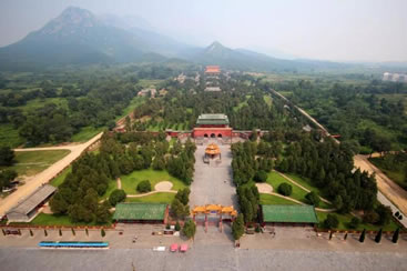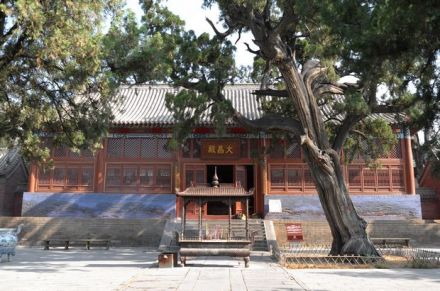 重檐慶殿頂,上覆黃色琉璃瓦,椽飛斗拱,梁枋天花,皆用清代最尊貴的和空彩畫(huà)。清初殿外還懸掛有宋人顏體“峻極殿”三字匾。