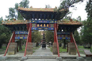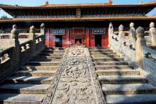 峻極殿前筑有3米高的月臺(tái),周圍有石雕欄桿,月臺(tái)正面有三道石階。中間的臺(tái)階分二路,二路間鑲有垂帶式“御路”一石,上面浮雕著精美的圖案,上截為“獨(dú)龍盤踞”,中間為“雙龍戲珠”,下邊為“群鶴鬧蓮”等紋飾。月臺(tái)下面為拜臺(tái),左右為兩座秀麗的御碑亭,兩亭均為重檐八角,東為“御捍亭”,內(nèi)立清乾隆十五年(1750年)的御碑,西為“御帛亭”,內(nèi)立清乾隆四十八年(1783年)的御碑,其字乃草書(shū)。