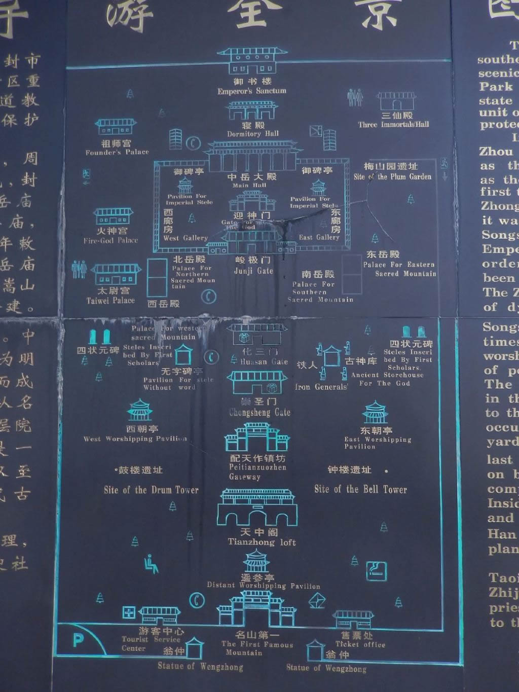 峻極門外臺(tái)階下東側(cè),有一座《五岳真形圖碑》,刻立于明萬(wàn)歷三十二年(1604年),碑上按照五岳的座落方位,雕刻著五岳圖,圖下刻記著關(guān)于五岳的傳說(shuō)!段逶勒嫘螆D》是根據(jù)“華山如立、泰山如坐、北岳如行、南岳如飛、中岳如臥”等不同特點(diǎn)繪制的代表五岳的象形碑。