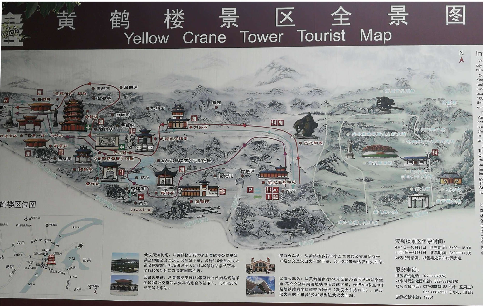 塔、碑廊、山門等建筑。整個(gè)建筑具有獨(dú)特的民族風(fēng)格。黃鶴樓內(nèi)部,層層風(fēng)格不相同。底層為一高大寬敞的大廳,其正中藻井高達(dá)10多米,正面壁上為一幅巨大的“白云黃鶴”陶瓷壁畫,兩旁立柱上懸掛著長達(dá)7米的楹聯(lián):爽氣西來,云霧掃開天地撼;大江東去,波濤洗凈古今愁。二樓大廳正面墻上,有用大理石鐫刻的唐代閻伯瑾撰寫的《黃鶴樓記》,它記述了黃鶴樓興廢沿革和名人軼事;樓記兩側(cè)為兩幅壁畫,一幅是“孫權(quán)筑城”,形象地說明黃鶴樓和武昌城相繼誕生的歷史;另一幅是“周瑜設(shè)宴”,反映三國名人去黃鶴樓的活動(dòng)。三樓大廳的壁畫為唐宋名人的“繡像畫”,如崔顥、李白、白居易等,也摘錄了他們吟詠黃鶴樓的名句。四樓大廳用屏風(fēng)分割幾個(gè)小廳,內(nèi)置當(dāng)代名人字畫,供游客欣賞、選購。頂層大廳有《長江萬里圖》等長卷、壁畫。
