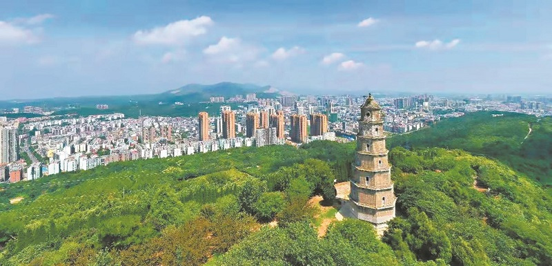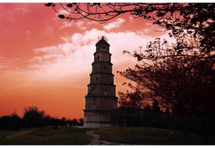 東寶塔是荊門(mén)今存的唯一一處具有千年歷史的地面文物,建于隋開(kāi)皇十三年(公元593年)。寶塔通高33.3米,底部周長(zhǎng)30.6米,七層四面八角,隔面設(shè)窗,攢尖式塔頂。塔基座周長(zhǎng)31.2米,高0.76米;隙加惺殢涀,須彌座八角各雕一尊托塔金剛。底層門(mén)楣有石刻“長(zhǎng)林頭角”四字,自底層有螺旋狀青石階梯上塔頂(海拔260米)。