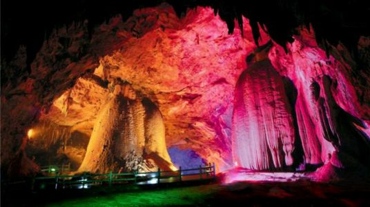 梅山龍宮位于湖南省婁底市新化縣資水河畔,是一個集溶洞、峽谷、峰林、絕壁、溪河、漏斗、暗河等多種喀斯特地質(zhì)地貌景觀于一體的大型溶洞群,有九層洞穴,探明長度2870余米,已開發(fā)游覽路線1896米,其中包括長466米世界罕見的神秘地下河。整個洞府分為龍宮迎賓、碧水蓮宮、玉皇天宮、龍宮仙苑、龍宮風(fēng)情、龍鳳呈祥六大景區(qū)。