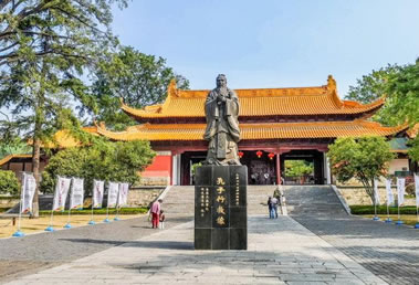 “萬仞宮墻”照壁面臨運(yùn)瀆,全長近百米。照壁南側(cè)有四個磚刻大字“萬仞宮墻”,每個字約1米見方。仞,是度量單位,我國古代八尺或七尺叫做一仞!叭f仞宮墻”出自《論語·子張篇》:“……夫子之墻高數(shù)(萬)仞,不得其門而入”,意思是贊喻孔子知識淵博,道德文章水平非常之高。