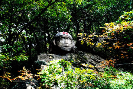 大圣佛是在自然石的基礎上,鑿刻而成的孫大圣頭像,供孫大圣的信仰者祭祀。孫悟空保護唐僧西天取回真經,功德圓滿,被如來封為斗戰(zhàn)勝佛,地位已遠遠高于觀音菩薩。斗戰(zhàn)勝佛,顧名思義是好斗善斗,而且是凡斗必勝。在人們心目中,孫悟空就是正義的象征,智慧的象征。每年臺灣地區(qū)和東南亞各國,都有很多進香團到花果山來朝拜孫大圣。