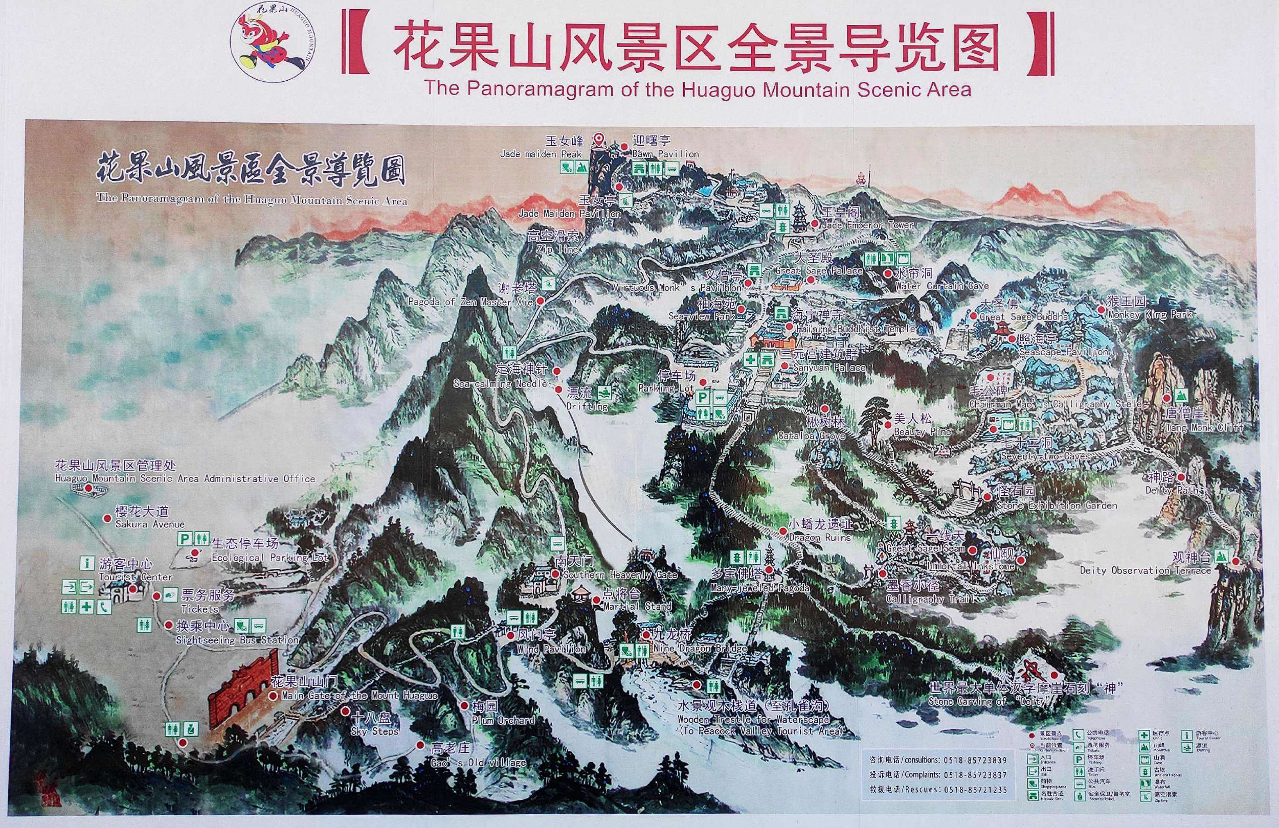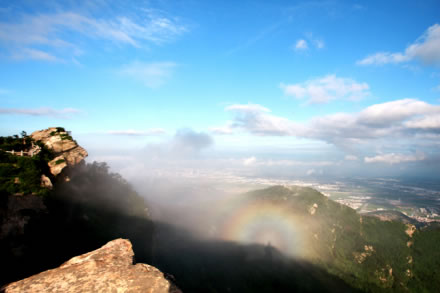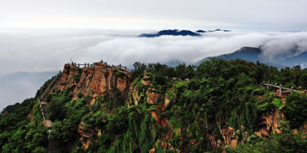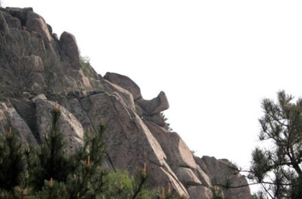 從遠處山腰眺望一線天,這里就是著名的八戒石.很像一個戴著僧帽的老豬在綠樹叢中呼呼大睡。一線天下面是花果山山名摩崖石刻,游客都愛在這里留影,青山紅字,非常壯麗。這里還有天然碑、硯石等景觀。沿小路前進可至墨香小徑,里面有百余位當代書法名家的作品刻在天然石塊上;還可至怪石園,看千奇百怪與《西游記》有關的象形石。“神”字王在東部禿龍溝下,是刻在山體上的懷素草書“神”字,長39.4米、寬15.8米,為世界上最大的單體漢字,1996年被載入吉尼斯世界紀錄。 登上玉女峰是花果山之游的高潮,有緣的人在這里可看到云臺山兩個最為精彩的景致。一個是在迎曙亭看海上日出;另一個是看云臺鋪海,白云翻滾好像海水揚波,露出來的峰頂就像大海里的蓬萊仙島,群山俯伏,阡陌縱橫,此情此景令人有飄飄欲仙的感覺。