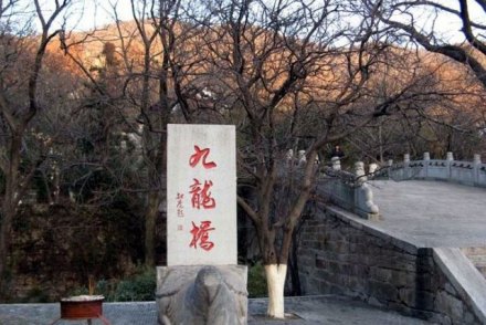 九龍橋是因為山上有九條山澗像九條舞動著的龍,從四面八方匯集于橋下而得名。那時候百姓都相信龍是神,一些香客就在此橋小憩一刻,來沾一點龍的壽氣,再進山求佛,保全家萬事平安,因此九龍橋又叫萬壽橋。傳說花果山上原來有十條龍,九條龍在山里面住著,為了防止外族侵犯,便派了一條本事最大的禿龍到東面的山頭守衛(wèi)。山東莊還有禿龍山,那龍山上還有兩個對穿的山泉就是傳說中的龍耳。我們可以在橋上往南望,那遠處的村莊便是山東莊。九龍橋畔有一棵千年老銀杏,粗大的枝椏已經擠進了橋身,橋上橋下布滿樹蔭,給游客提供了休息納涼的理想場所。