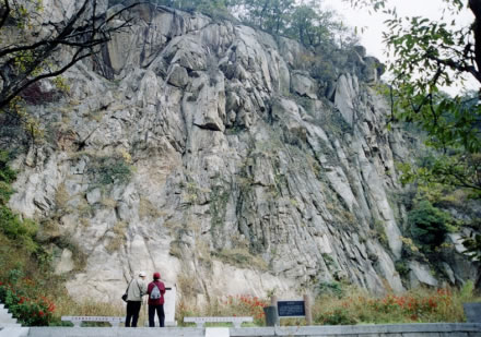 唐僧崖,又叫“大佛崖”,是由片麻巖石風化而成的一堵高達數(shù)十米的峭壁陡崖。站在三元宮停車場東望,即可見唐僧和孫悟空師徒倆立在崖上的形象:唐僧兩耳垂肩,佛眼微閉,背稍躬,好像正在肅目修行;右旁一天然石猴,似乎在與唐僧耳語。神采逼真,栩栩如生。走到近前,由于崖壁紋理復雜多彩,還可以看到許多奇景點綴其間,有師徒對話、舍身飼虎、獨角鬼王等,所以有人又把它叫做“萬佛崖”。