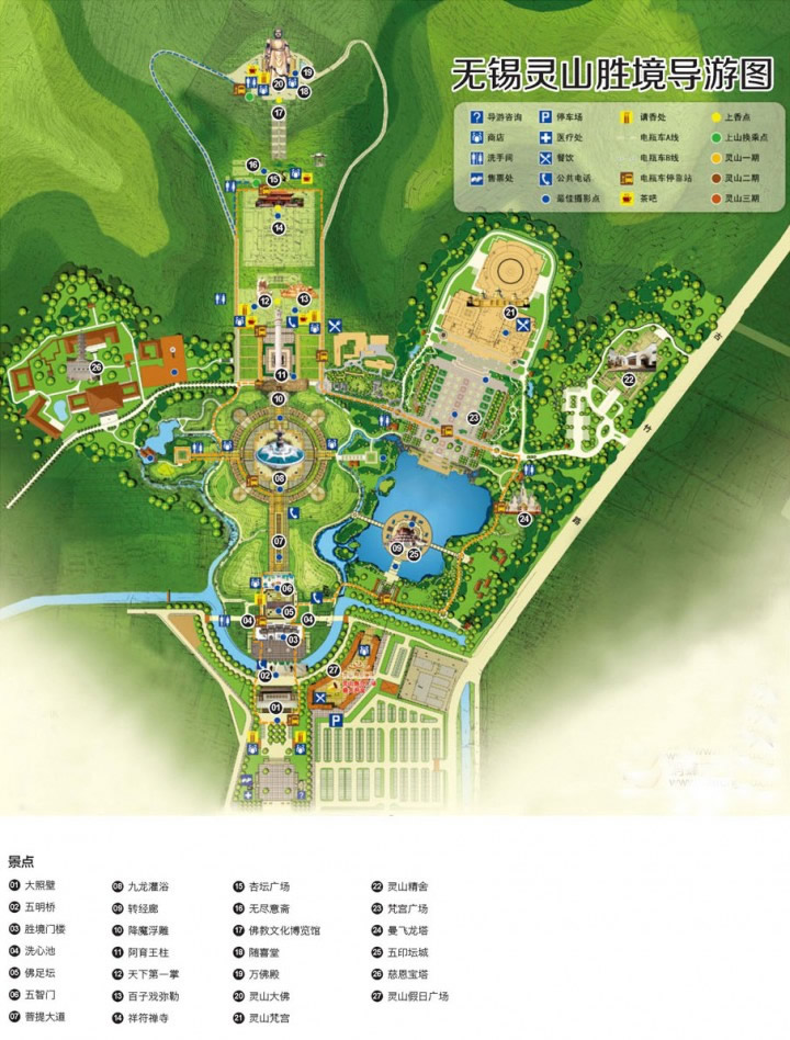 要的關(guān)系。靈山勝境的整個(gè)地形尤如一張?zhí)珟熞,背靠小靈山,左邊青龍山,右邊白虎山,北踏青峰,盡攬山形之美,南望太湖,一挹水色之秀,這種傳統(tǒng)風(fēng)水理論上稱為"八風(fēng)吹不動(dòng),端坐紫金蓮"的地形是大吉之地,為保存這吉祥的靈氣,所以造大照壁來(lái)收氣,同時(shí)也通過(guò)照壁上的內(nèi)容引領(lǐng)游客走進(jìn)靈山的佛教文化歷史世界。