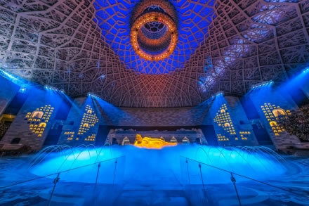 禪境大觀的頂部是娑羅穹頂,圖案來源于佛陀涅槃時的娑羅樹杈。穹頂采用了全覆蓋的透光膜和燈光,可以營造出清晨的第一縷晨曦、正午熱烈的日光、傍晚的彩霞和入夜的月光。