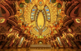 作為佛頂圣境區(qū)的核心之一,佛頂宮坐落于牛首山西峰之處,建基于歷史遺留礦坑之上,總建筑面積約13.6萬平方米,與佛頂塔共同構成牛首西峰新景象,與牛首東峰遙相呼應,再現牛首“雙峰雙闕”并峙的宏偉盛景。整個佛頂宮以佛祖頂骨舍利供奉為主題,外部分為大穹頂和小穹頂兩個部分,寓意外供養(yǎng)和內供養(yǎng)。大穹頂形如佛祖袈裟覆蓋在小穹頂之上,象征著佛祖的無量加持;小穹頂下部為蓮花寶座造型,上部為摩尼寶珠造型,上下結合形成“蓮花托珍寶”的神圣意象。